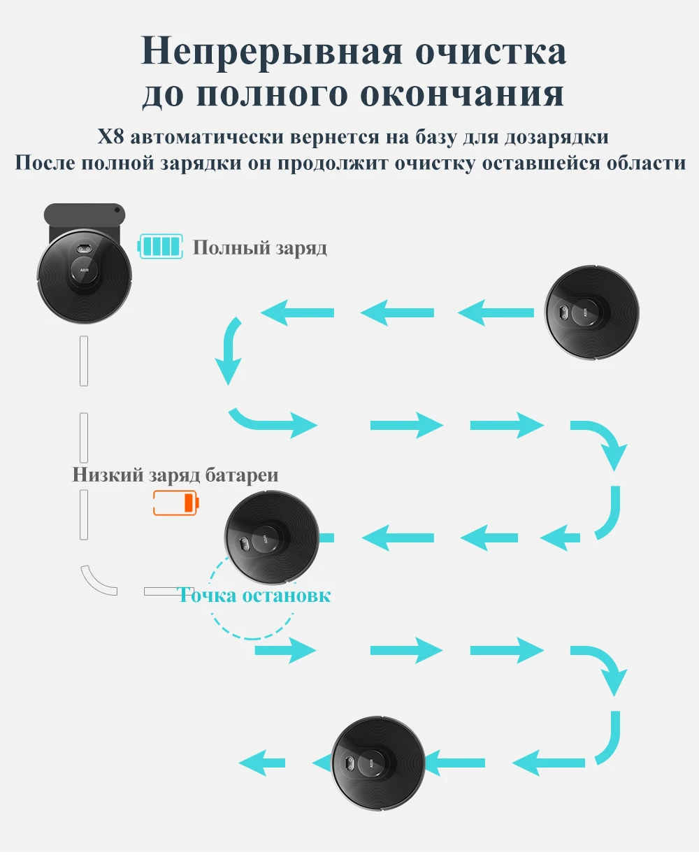 ABIR X8 разрядится до того, как закончит уборку, то он поедет заряжаться на базу. Затем он продолжит уборку с того места, где она была прервана.