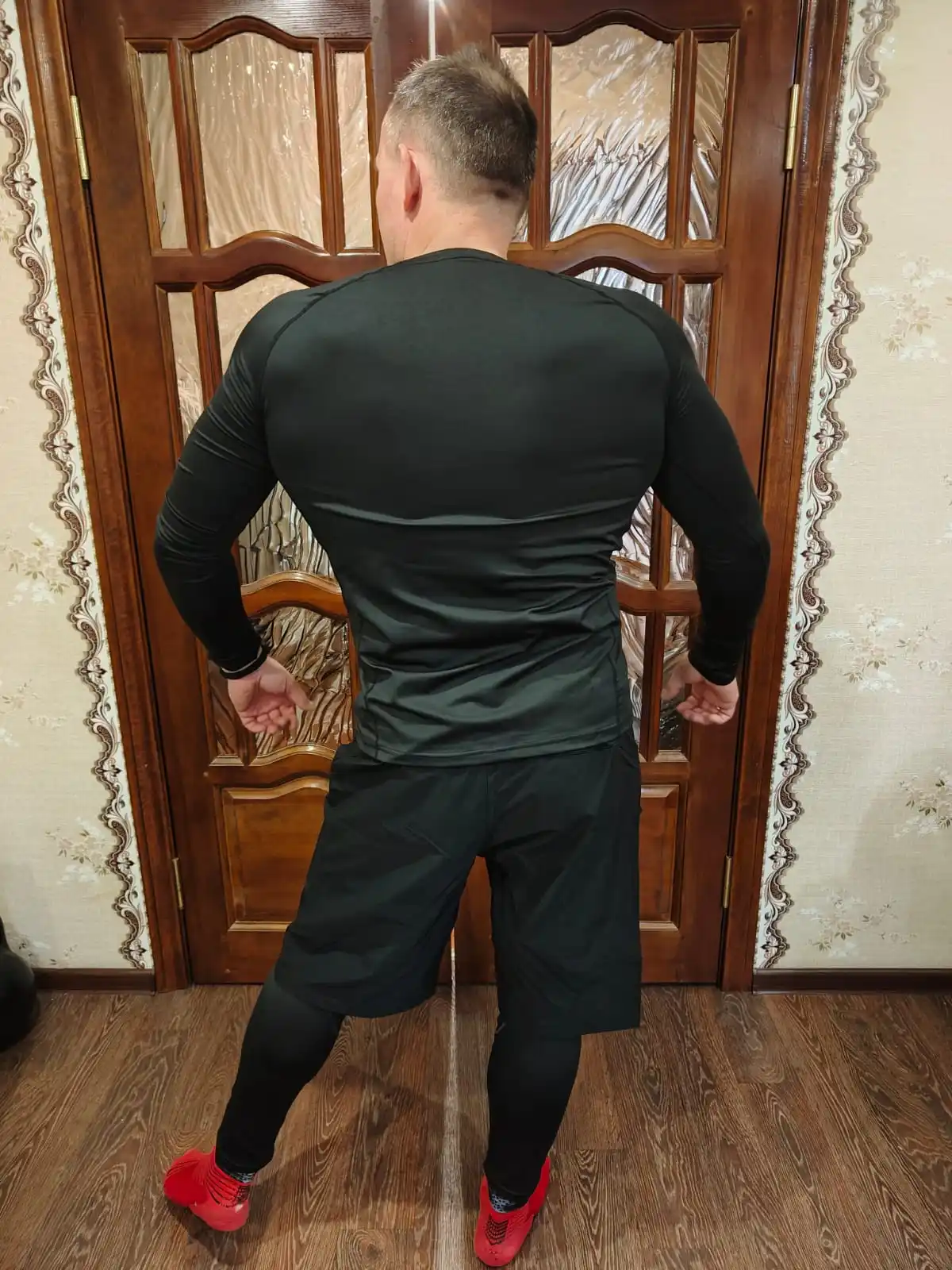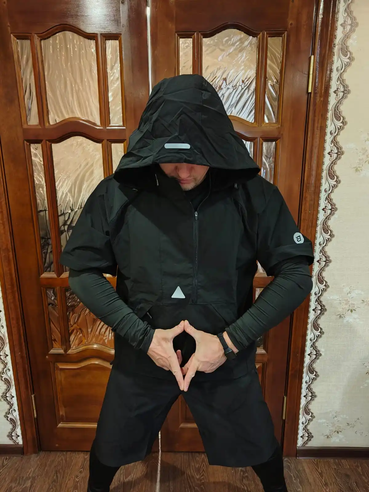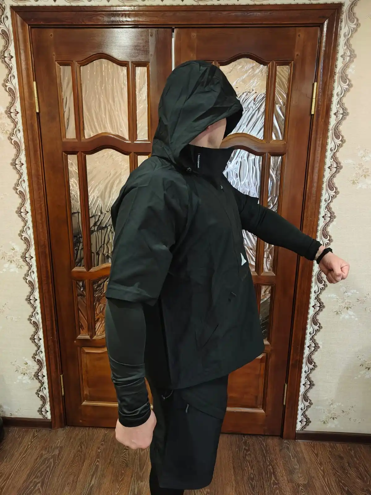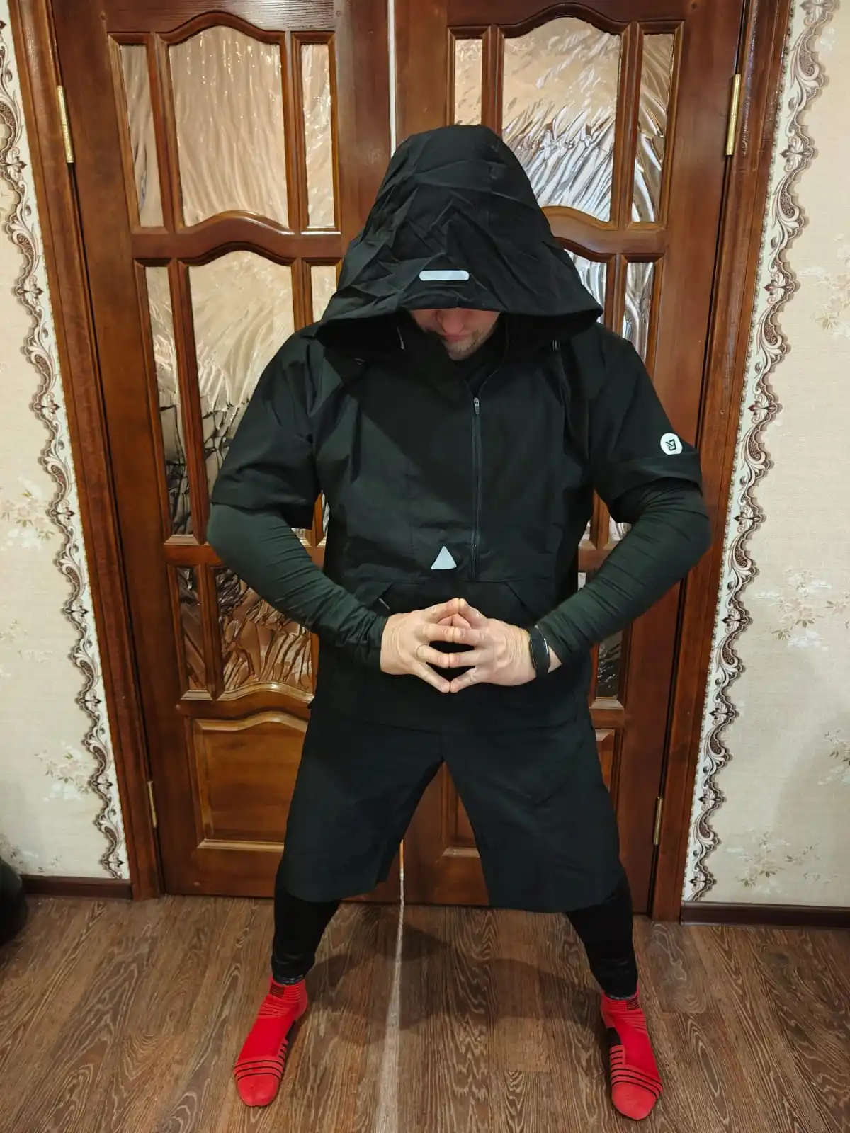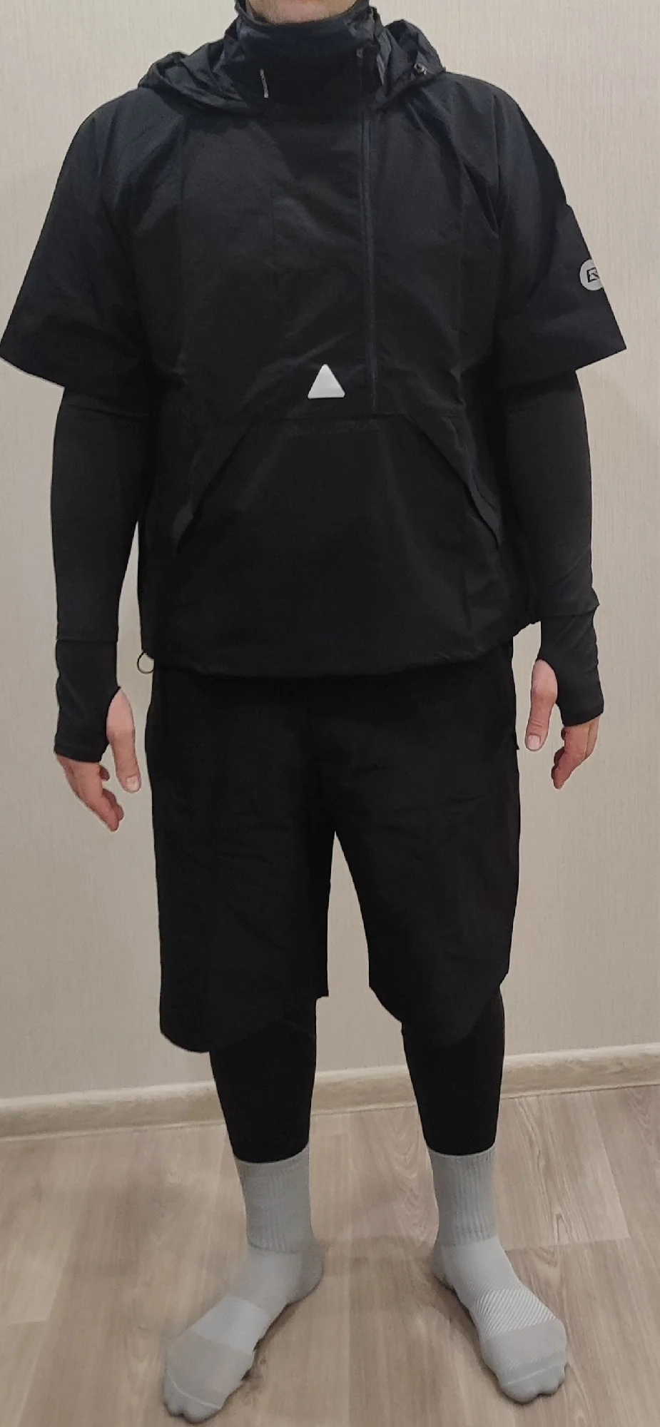 Отличный фитнес-гарнитур----сшито добротно, куртка и шорты из плащёвки, так что, при интенсивной эксплуатации прослужат долго. Также порадовали функциональные элементы, которые присутствуют на куртке, а именно участки сетчатой материи в местах интенсивного потоотделения. А теперь о том, как не ошибиться в выборе размера :--- при моём росте в 173 см., и весе в 76 кг. выбор пал на size М. Как раз моим размерчиком оказался--- термобельё сидит плотнячком, на теле не болтыхается, ни коротковато и ни длинновато, самое то. Так что, товар отличный, своих денег стоит.)))