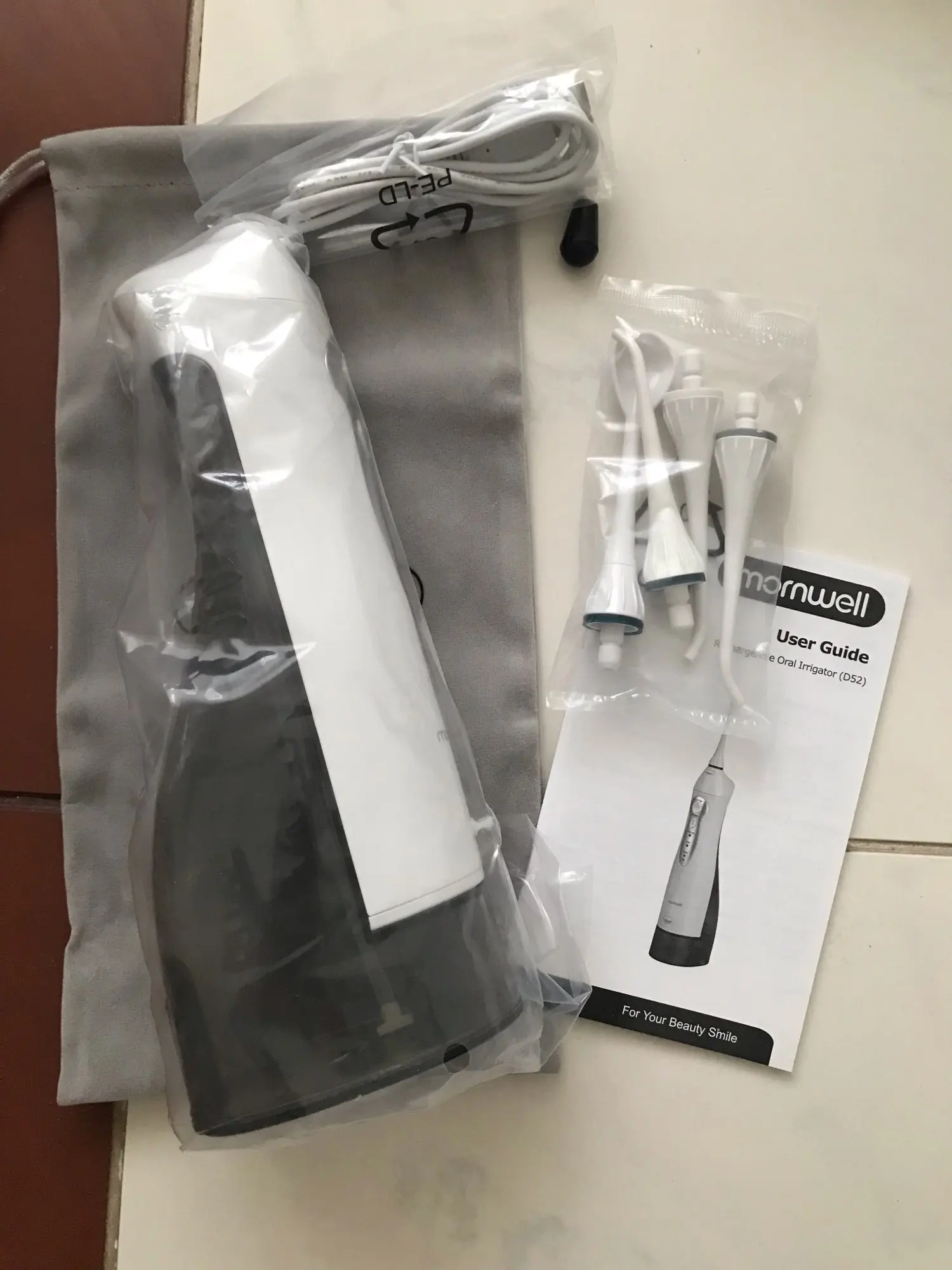 Мой первый ирригатор. По нему довольно много хороших отзывов, но к сожалению у некоторых он выходит из строя через 2-3 месяца эксплуатации. Пришёл за 2 недели, получила на кассе в «Пятерочке». Был в простом посылочном пакете. Коробка не помята. В составе: тряпичный мешок, инструкция, ирригатор, 4 насадки и шнур для зарядки. Не тяжелый. Как использовать понятно без инструкции. В задней нижней части отверстие, в которое наливается вода. Расход довольно быстрый. Струя бьет не больно. Надеюсь через пару месяцев не сломается как пишут в отзывах :)