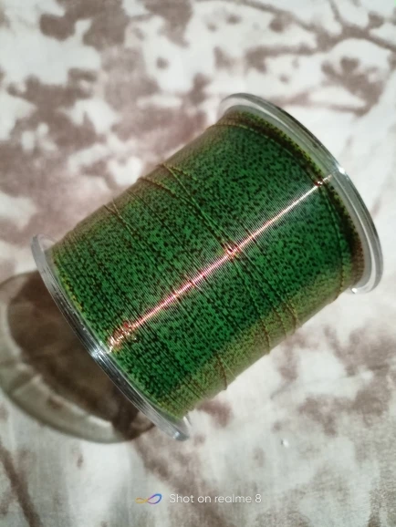 Поскольку это камуфляжная леска, поверхность лески покрыта меняющим цвет покрытием, которое будет отображать другие цвета в теплых или тусклых условиях. Пожалуйста, следуйте моему методу, оторвите пленку за пределами лески и возьмите леску. Перейдите в более яркое место, и увидите, что она зеленая.