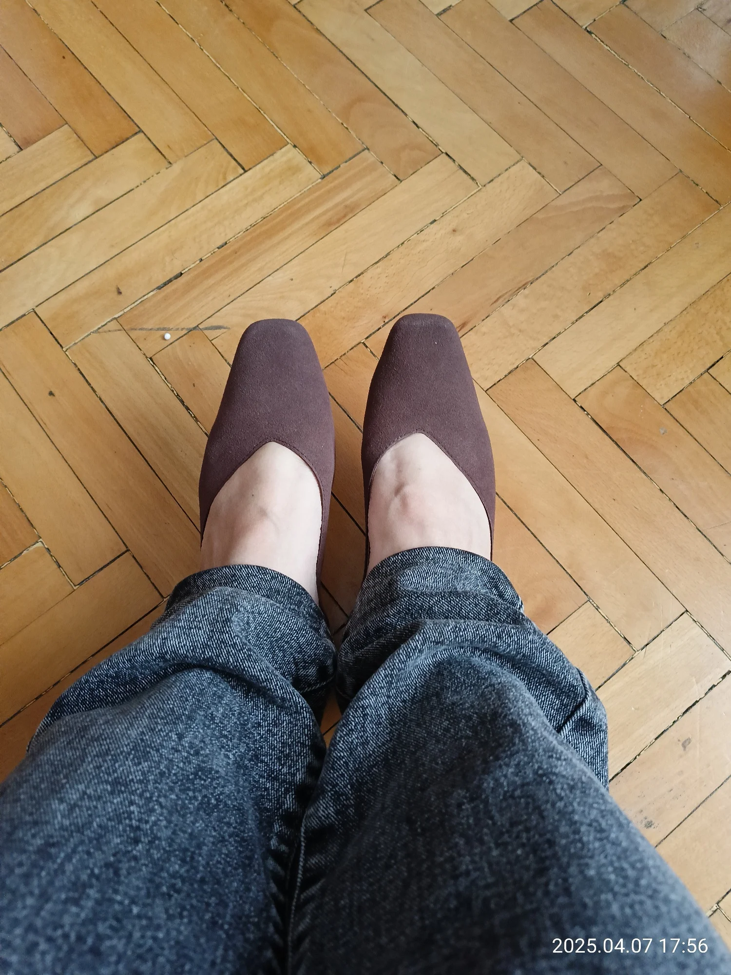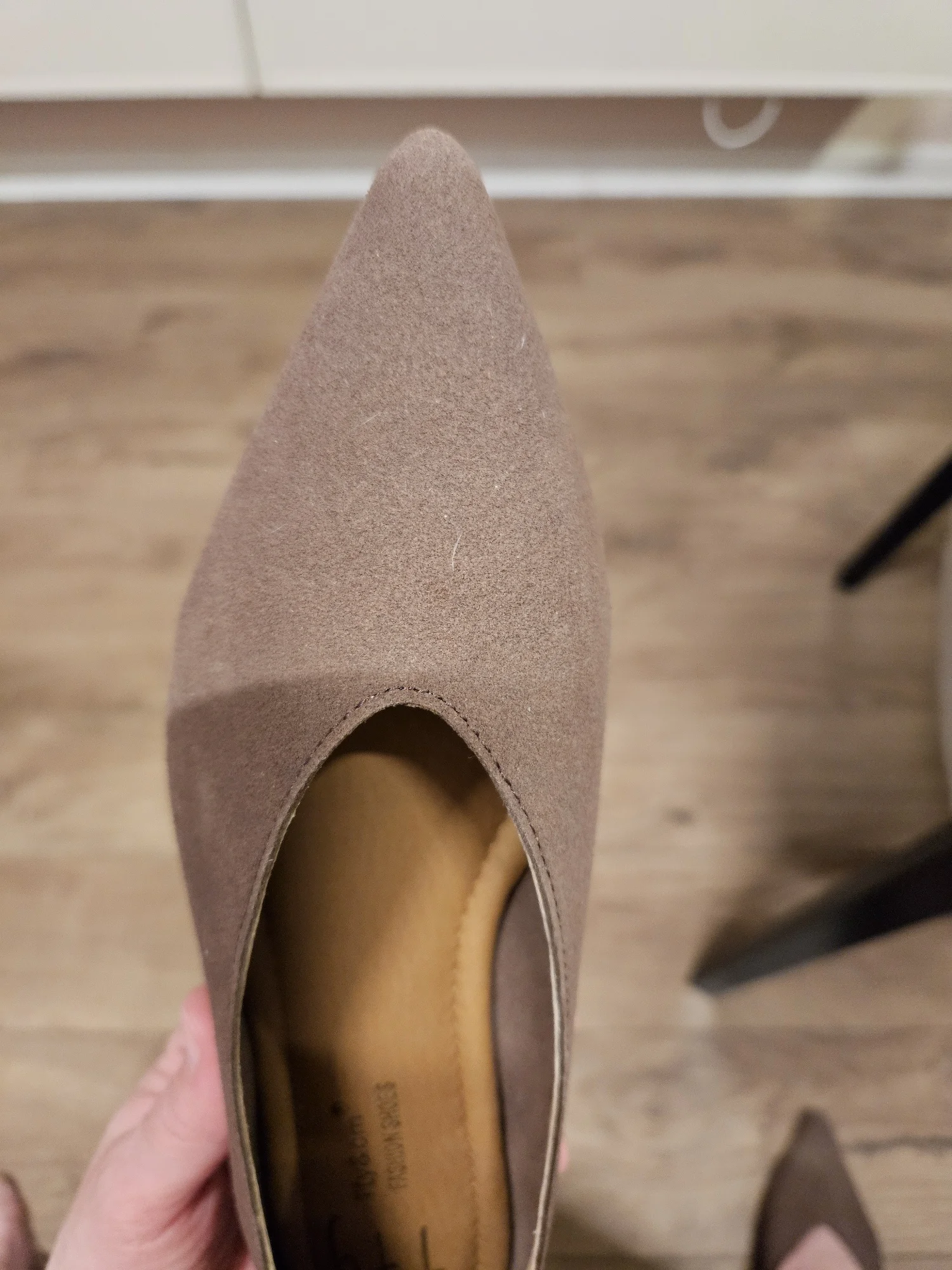 На одной туфельке светлое пятно на носу. При хорошем освещении видно, как будто затерта замша. Цвет туфлей отличается друг от друга, видимо брак