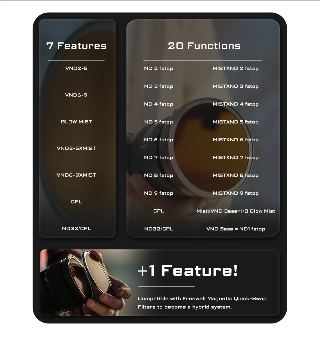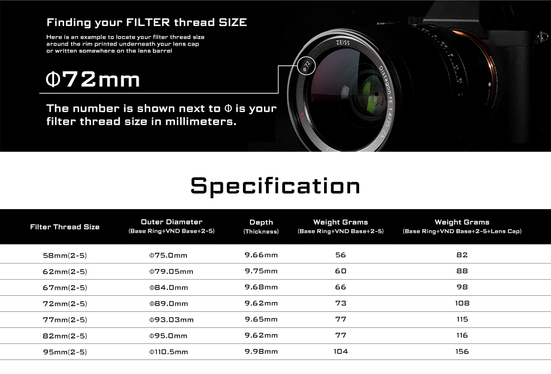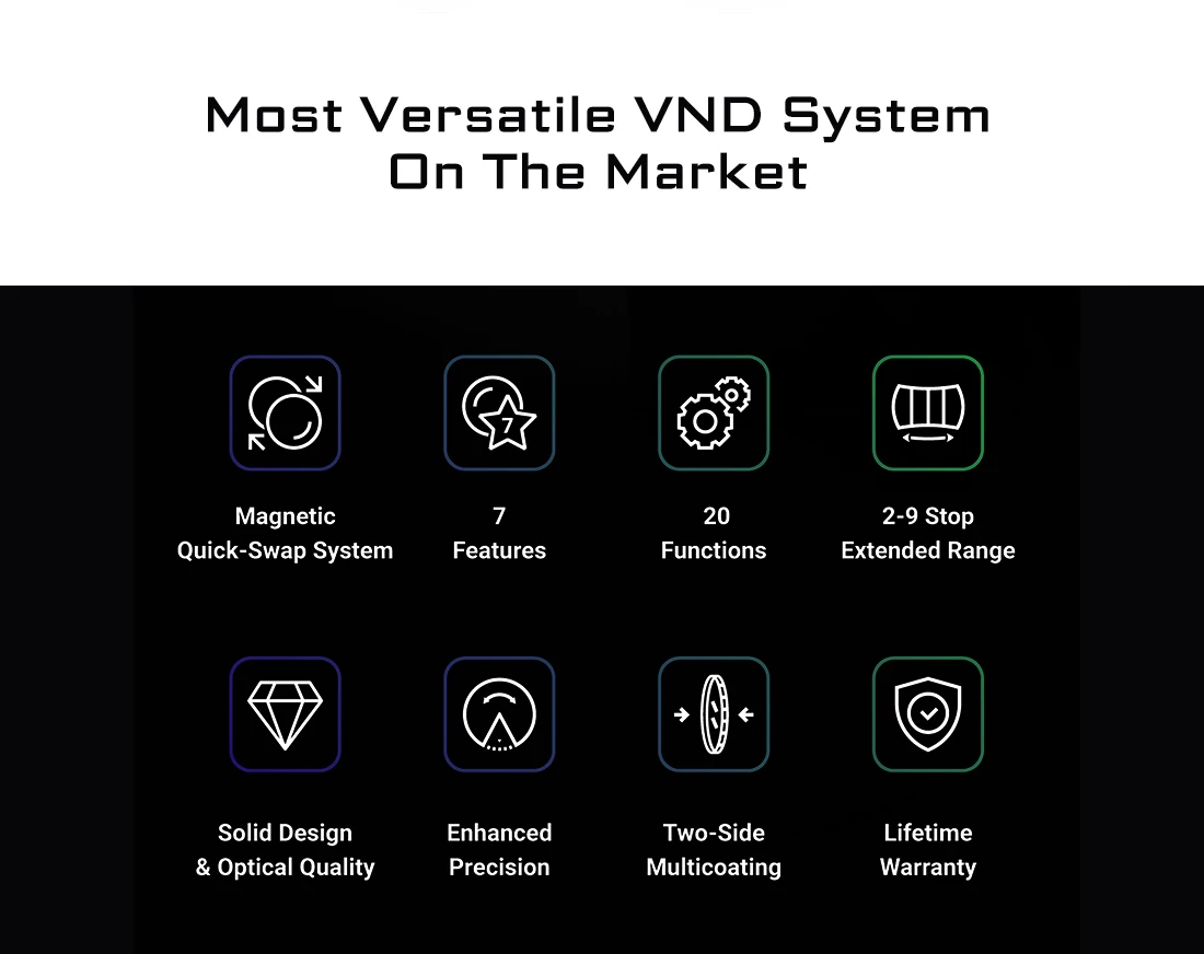 -Что включено: VND2-5/CPL, VND6-9/ND32-CPL, база VND, база MISTXVND, базовое кольцо, крышка объектива, ткань для очистки микрофибры